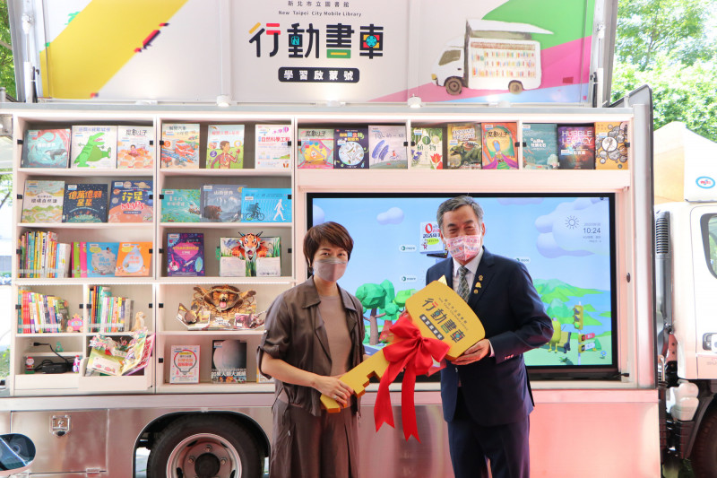 新北市立圖書館表示,國際獅子會300-B1區總監陳賢能今代表捐贈代表「學習啟蒙號」,為新北市第4部行動書車,可容納1800冊圖書、50多種雜誌,同時配備86吋數位觸控螢幕提供閱讀推薦,掃描QRCcde還可借閱10萬種電子書。