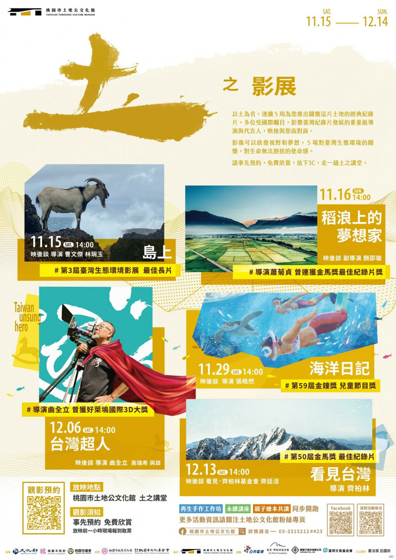 〔記者周敏鴻/桃園報導〕桃園市土地公文化館將於11月15日到12月14日間的週末假日,推出「土之影展」,免費播映《島上》等5部紀錄片,部分活動須事先報名、即起開放預約,相關資訊可洽活動官網(https://www.taoyuantudigong.org.tw/)。