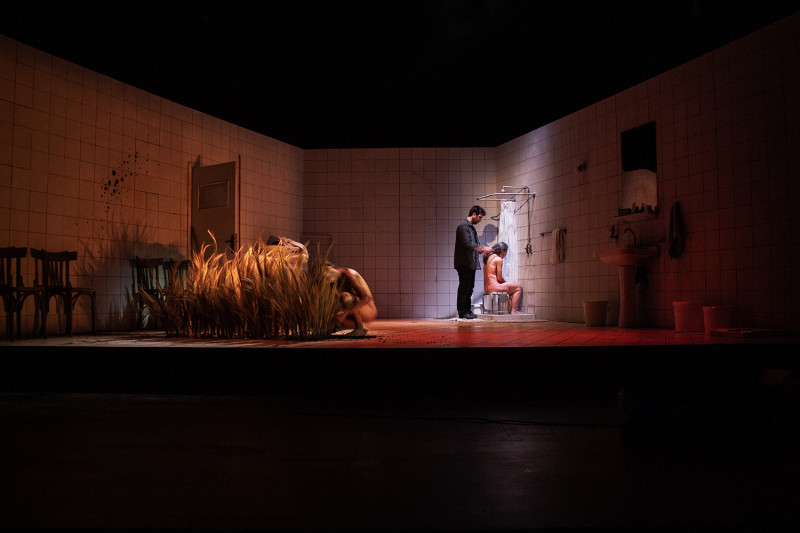 《仁慈小酒館》是貝努西「親情三部曲」最終章,以一盞從阿爾巴尼亞地拉那街區帶出的霓虹燈招牌,串起導演追憶父親的旅程。舞台靈感來自導演奶奶家的白瓷浴室,貝努西說:「浴室是一個極度私密又充滿象徵性的場域。我們在那裡最為赤裸,不只身體,也包含情感。」在此,繼母與姊妹以身體語言展現人類最原始的需求,如進食、沐浴、排泄、傷害、撫慰等;舞台上的空椅子象徵父親位置的永恆空缺,也承載著家庭連結的力量,以及在無聲之中對亡父的思念。