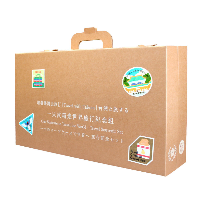旅行紀念組外盒設計成行李箱,印有日文與英文「跟者台灣去旅行」的字樣,以及總統府與故宮聯名的標誌。(故宮提供)