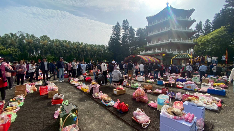 葉五美宗族於祖塔前參與祭祖儀式,每每有數千人自發參與。(桃市文化局提供)