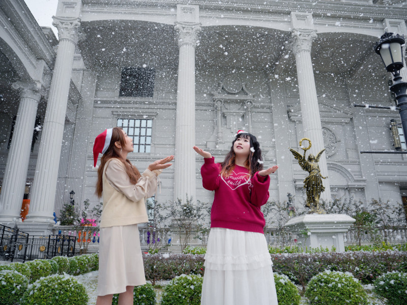佐登妮絲城堡即日起至明年2月22日,推出南台灣最大的人造雪景,每週末限時飄雪登場。(佐登妮絲城堡提供)