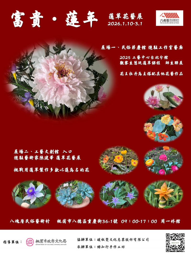 〔記者謝武雄/桃園報導〕八塊厝民俗藝術村自2022年開放在地藝文團體與藝術家進駐;今年開春由駐村藝術家陳建華推出個展「富貴.蓮年」,以蓪草工藝為核心媒介,透過花卉、鳥蝶等自然意象,展現傳統工藝所蘊含的祝福寓意與生命韌性,展覽將於1月10日起至3月1日止,於民俗節慶館駐村空間廊道及工藝文創館入口展出;詳情可洽八塊厝民俗藝術村官網https://www.bakuaicuo.com.tw/ 查詢。