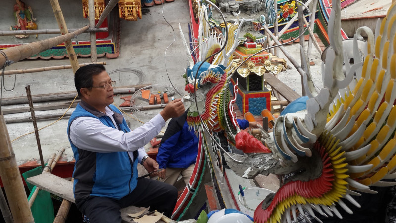 圖為鄭盛宏參與蘆洲保和宮剪黏修復過程。(苗縣府文觀局提供)