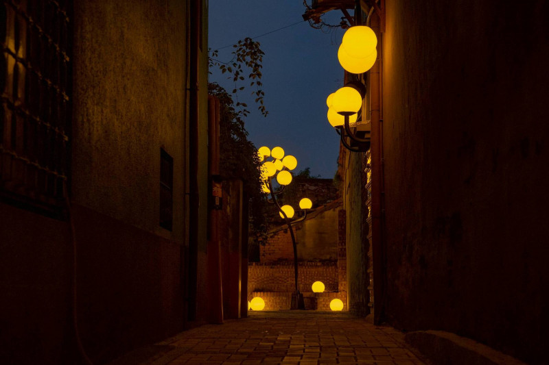 擅長雕塑和空間裝置的藝術家石孟鑫,常以生活物件拼裝、變形,活用畸零空間,讓物件和空間產生對話。石孟鑫說,這次在魚鱗巷展出《路燈樹》,靈感來自鹽水早年倒風內海的潮汐與風勢,讓許多路樹在歲月中傾斜生長。作品將台灣家戶常見的黃色門柱燈變形,模擬路樹傾斜生長的姿態,從街角的空隙中伸展,像是在訴說一段被海風推動過的身體記憶。小型的黃球燈則從牆面縫隙與殘痕中生長出來,像是光的果實,在夜間用柔和的光暈染魚鱗巷,讓老巷弄更加迷人。