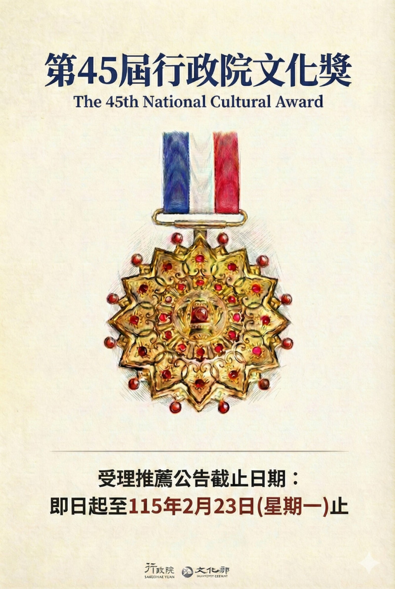 〔記者凌美雪/台北報導〕第45屆行政院文化獎自即日起至2月23日受理推薦,主辦單位文化部表示,行政院文化獎是由我國政府主辦並頒發的最高榮譽文化獎項,藉以表揚對台灣文化具特殊及重大貢獻的國內外傑出藝文人士。辦理至今已有99位文化人獲得殊榮。