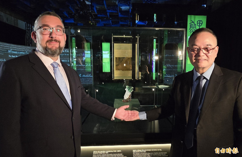 捷克國家博物館總館長盧卡其(左)信守承諾親自押運〈翠玉白菜〉返台。圖為去年9月故宮在捷克展開幕時與蕭宗煌院長合影。(記者凌美雪攝)