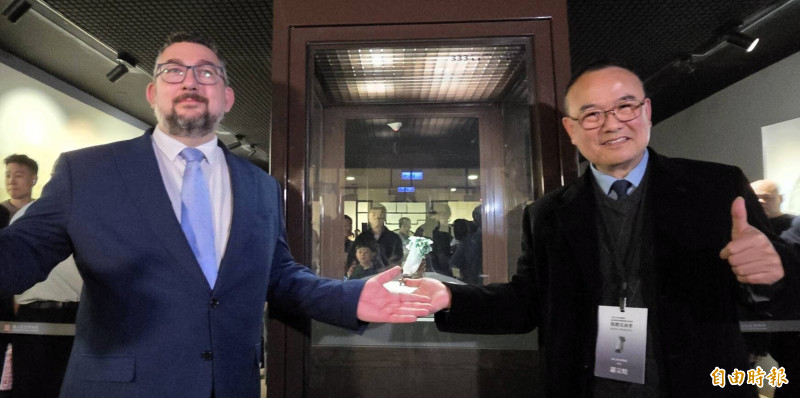 〈翠玉白菜〉從捷克國家博物館回到故宮展出,捷克方的總館長盧卡其(左)與故宮院長蕭宗煌,開心復刻兩人在捷克一起介紹〈翠玉白菜〉的畫面。(記者凌美雪攝)