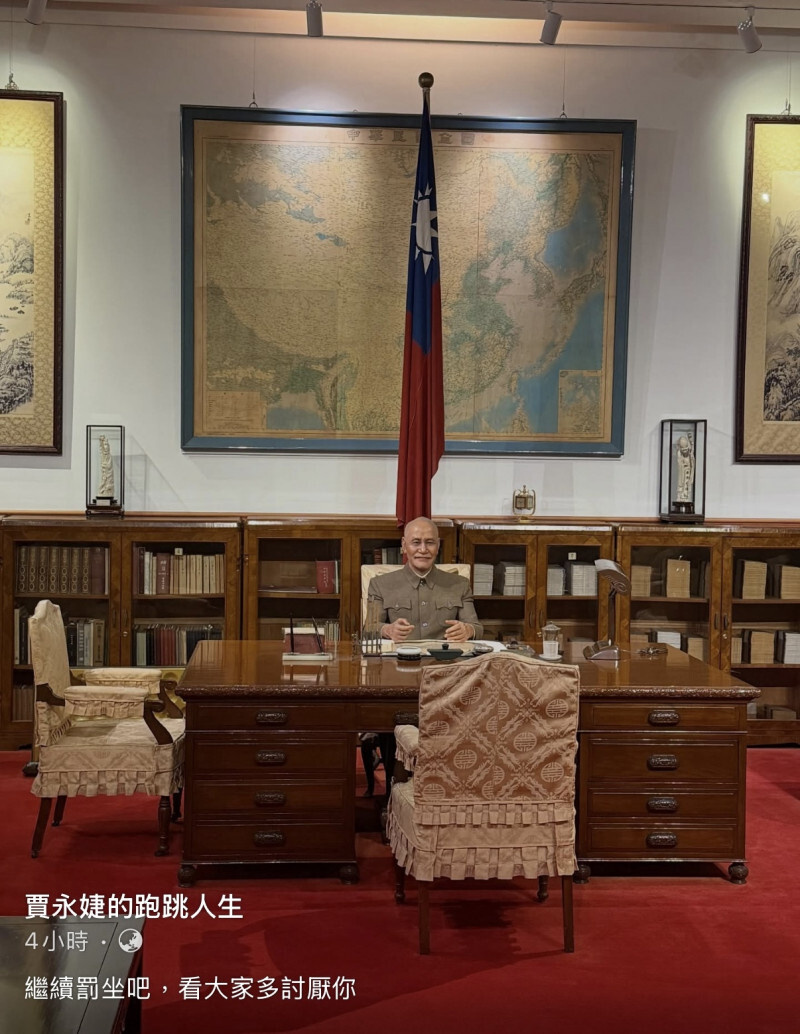 其中,22日在臉書張貼的一張蔣中正辦公的展覽照片,附註了「繼續罰坐吧,看大家多討厭你」,迅速吸引破萬人按讚,台灣知名的當代藝術家蘇匯宇也在自己臉書貼文:「賈董叫蔣介石罰坐真的很猛!可以建議文化部把蔣介石的桌子椅子拿走讓他半蹲。」