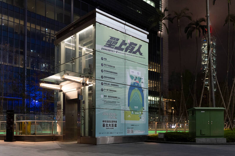 位於大巨蛋旁的玻璃電梯,有特展各展區路線圖。(文化部提供)