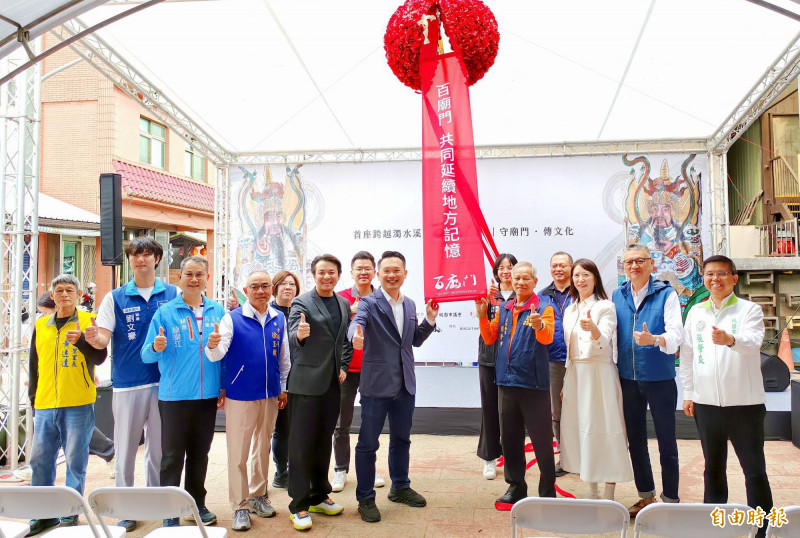 桃園市副市長蘇俊賓(左6)宣布,龍潭三坑永福宮6扇門神已經加固保存將進行修復活化。(記者李容萍攝)