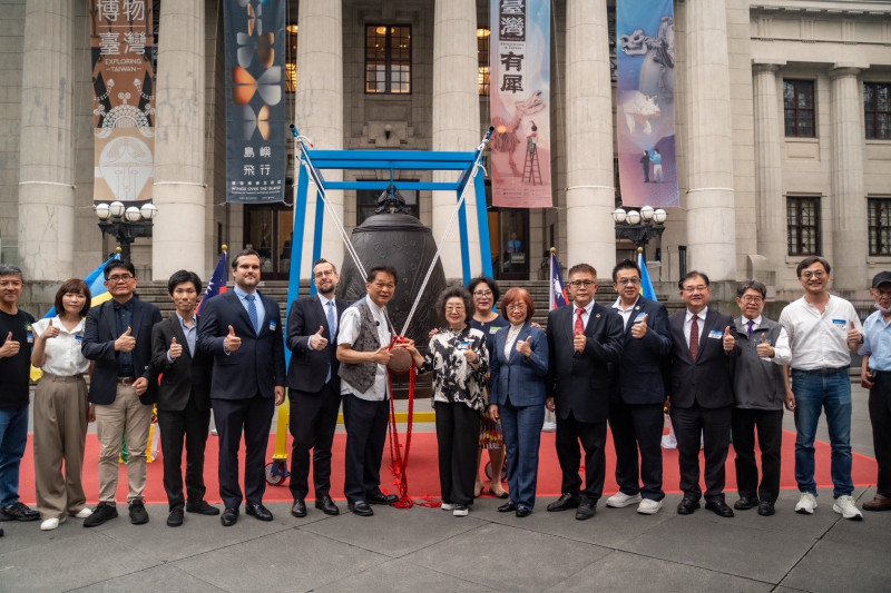 長期旅居紐約的台灣藝術家林世寶(左7)發起「和平鐘聲從台灣響起」活動,今日於台博館前廣場舉行「和平鐘」揭幕暨敲鐘儀式。(盾牌藝術基金會提供)