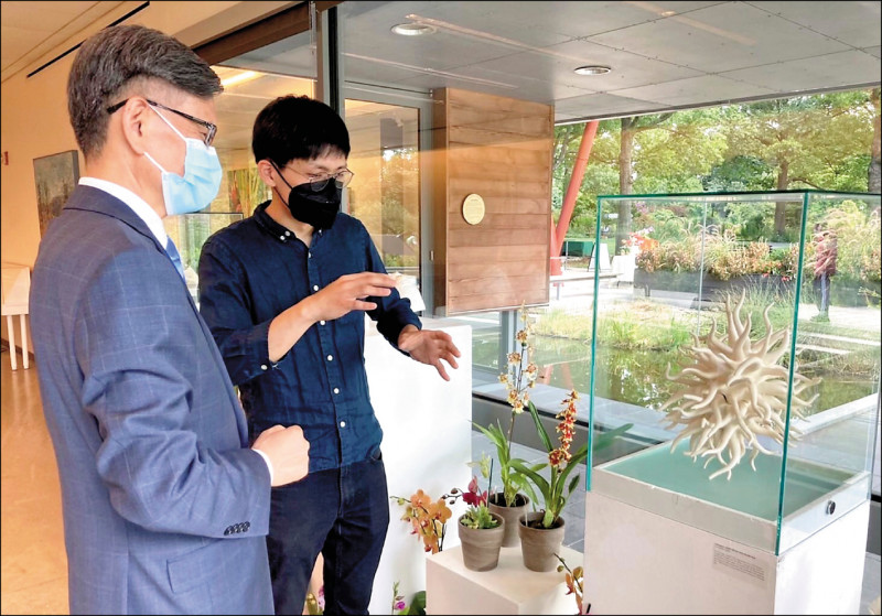 【藝術文化】為紐約台灣蘭展量身創作 旅美當代藝術家連結愛郭家瑄為駐紐約辦事處長李光章(左)介紹作品〈未知物件001〉,陶瓷,12x12x12英寸。