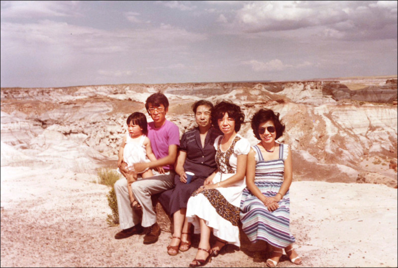 郭松棻〈雪盲〉:「沙漠反射的光芒侵入你的肺腑,照耀了內心的一切,沒有一片陰影可以留存。」1982年夏天,家人在亞利桑那團聚,右起郭珠美、郭惠美(二姊)、林阿琴(母親)、郭松棻、郭靖怡(二姊女兒)。在彼時親情環繞的盛夏光影中,驅散了作家內心的抑鬱,預示了重返文學的開始。(郭珠美提供)