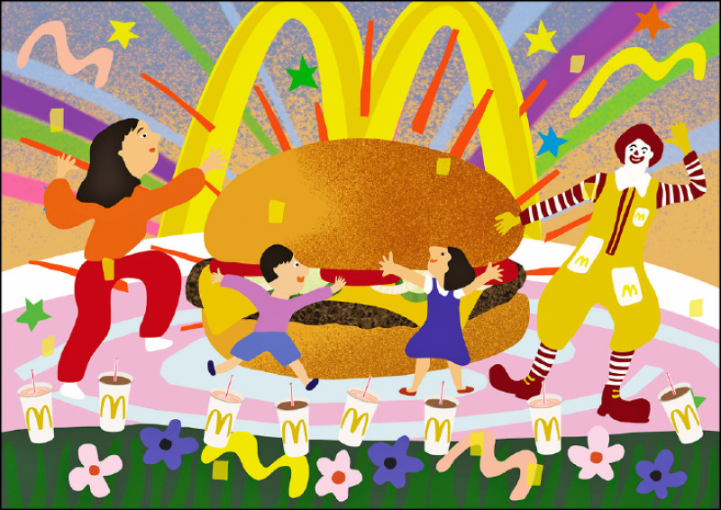 M形大招牌、麥當勞叔叔在門口迎接。媽媽點了吉事漢堡和奶昔,餐盤上胖嘟嘟的漢堡、顏色鮮豔的桌椅都讓我感到驚奇。初嘗「漢堡」,麵包包覆肉排和起司,是鹹香的新奇;一口吸進「奶昔」,是冰涼的甜蜜,天底下怎有如此美妙的滋味啊!因為捨不得,我們花了很久的時間才吃完,媽媽還買了「麥當勞叔叔掛筆」給我們,只覺得幸福得要滿出來了!