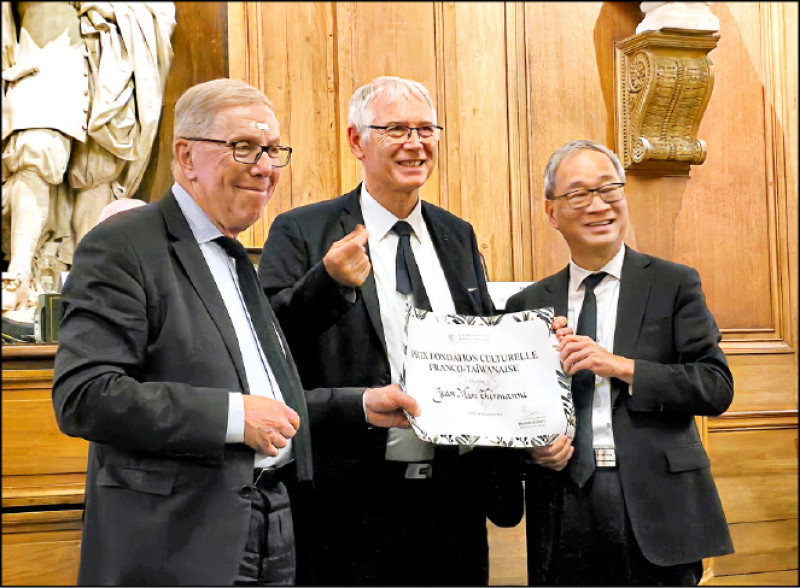 文化部長李遠(右)與法蘭西學院終身秘書博恩那.史蒂恩(左),共同頒獎給FICA影展創始人兼藝術總監尚馬克.鐵胡萬(中)。(記者凌美雪攝)