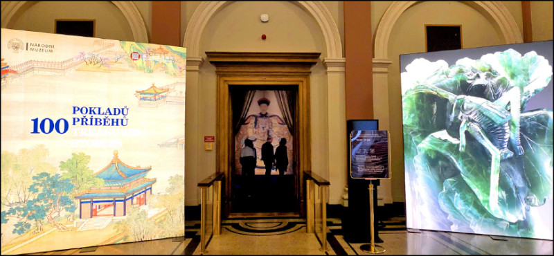 故宮展覽入口左邊標示著「故宮文物百選及其故事」的英文與捷克文,右邊則是指標文物〈翠玉白菜〉。