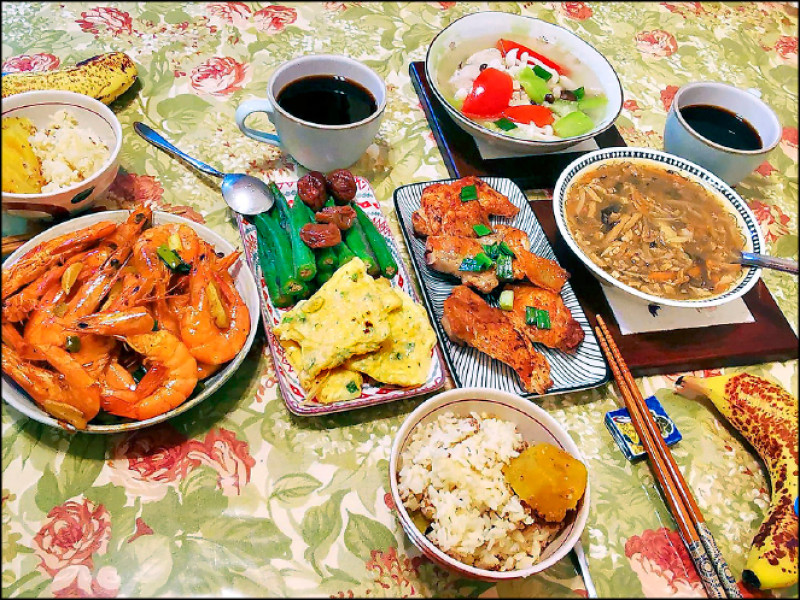 菜色說明:星期假日,即便天氣帶著暑熱,老妻還是會洗手做羹湯,下廚煮一桌菜。但說是一桌,因為只有我們兩老在家,每樣的份量也不多。煎蛋配秋葵、炒雞塊、一些炒蝦、野菇絲瓜,配上糙米地瓜飯。水果是助消化的香蕉及咖啡兩小杯,可助飯後閒聊。