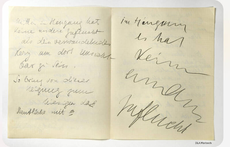 是里爾克的遺稿。他略帶不安的字跡傾斜著,像風中纖秀的草葉。我年輕的詩友鄒佑昇告訴我,這是《杜伊諾哀歌》第九哀歌未收入的幾句詩。他細細解說其中遣辭用句的變化與多義,例如: