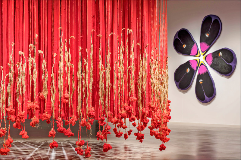 宜德思.盧信〈花心〉(右)木板、壓克力顏料,120×80×4公分(×5件),2025;宜德思.盧信與尤佑倍苓 〈編織生命的紅〉(左)苧麻線、毛線、布、陶,尺寸依空間而定,2020-2025。