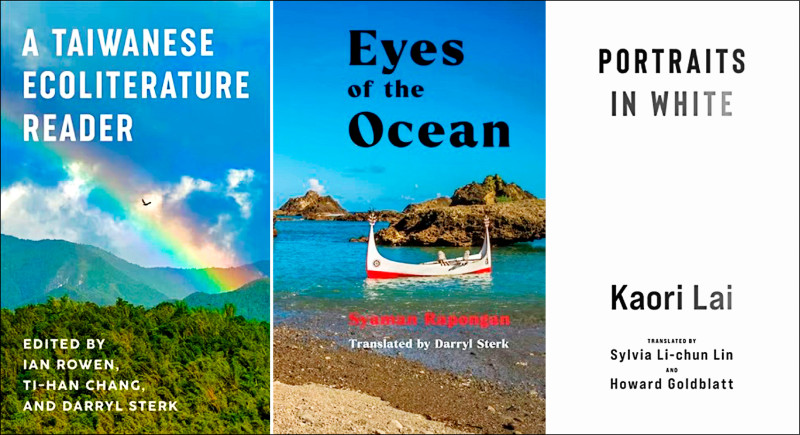 台灣文學LiFT書系再拓版圖,左起外譯3本書包含《A Taiwanese Ecoliterature Reader》(台灣生態文學讀本)、《Eyes of the Ocean》(大海之眼)、《Portraits in White》(白色畫像)。(台文館提供)