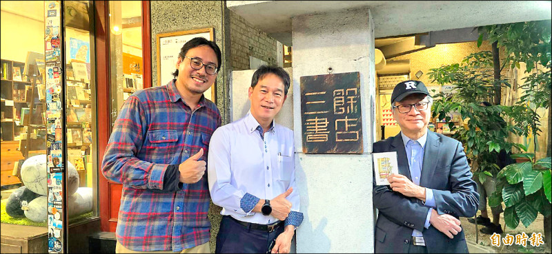 文化部長李遠(右)與三餘書店其中2位負責人鍾尚樺(左)、童維辰合影。