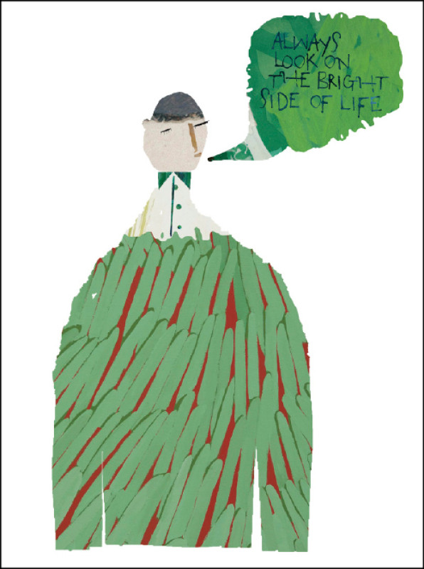 但是,1975年英國人拍的那部喜劇片《巨蟒和聖杯》,片尾眾人歡樂唱道:「總是望向人生光明面」(Always Look On the Bright Side of Life)就浮上心頭,想跟唱歌者一樣吹著口哨,生命給我們什麼,都可以是養分,在狀似悲劇的事件裡可以發現喜劇的成分。其實,我一直要用這首歌說服自己,但我完全沒有做到。