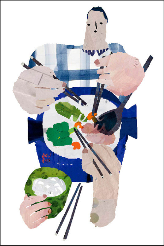 他會要求每個人都要有一副公筷,以防萬一我們不小心把自己的筷子放進鍋子裡,我們必須全程保持緘默,就像在舉行一場不為人知的祕密會議。而上菜的順序不可違背,必須先放他熱愛的高麗菜、金針菇,再來是豆腐和芋頭,絕對不能先放肉食和海鮮,否則會破壞湯底原本的味道。