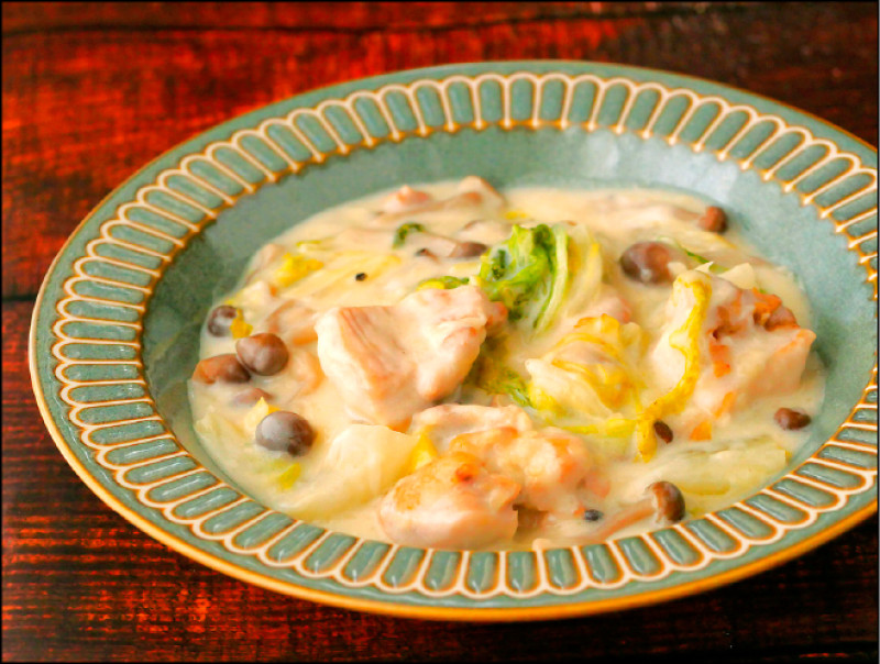 雞腿肉300g、白菜1/8個(300g)、鴻喜菇1/2包、酒40ml、麵粉3大匙、奶油10g、牛奶100ml、A(鹽1/4∼1/2小匙、顆粒日式高湯粉1/2小匙)、沙拉油1小匙