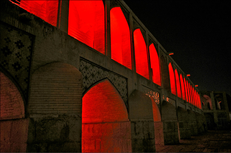 薩非時代建造的孔橋,以堅硬的姿態跨越河床,連結了城市重要區域的兩岸。橋的上方是平坦路橋,下方則是一顆顆水珠般的孔狀拱門,高挑堅固,撐出了能避風躲雨的橋下空間,於是到了夜晚,伊朗人便常在這裡集會。