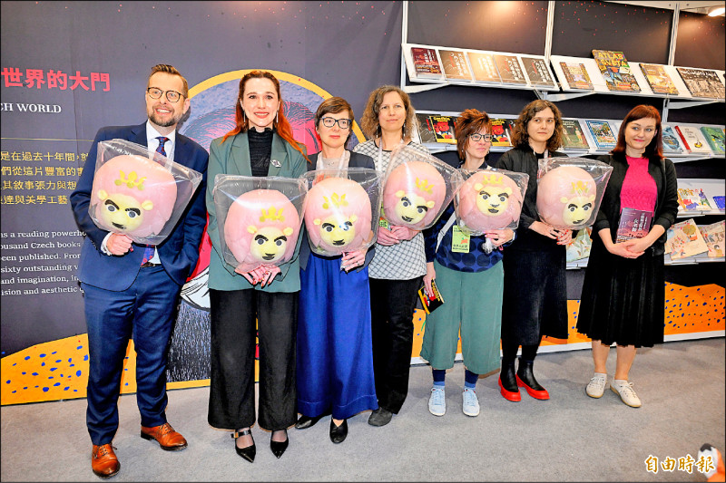台北國際書展捷克國家館開幕,捷克經濟文化辦事處處長史坦格(左起)、捷克中心台北主任馬凱棠、捷克館策展人Jitka Nesporova以及捷克作家、出版人們合影。 (記者胡舜翔攝)