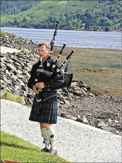在城堡前表演風笛的街頭藝人,身著傳統蘇格蘭服裝令人印象深刻。